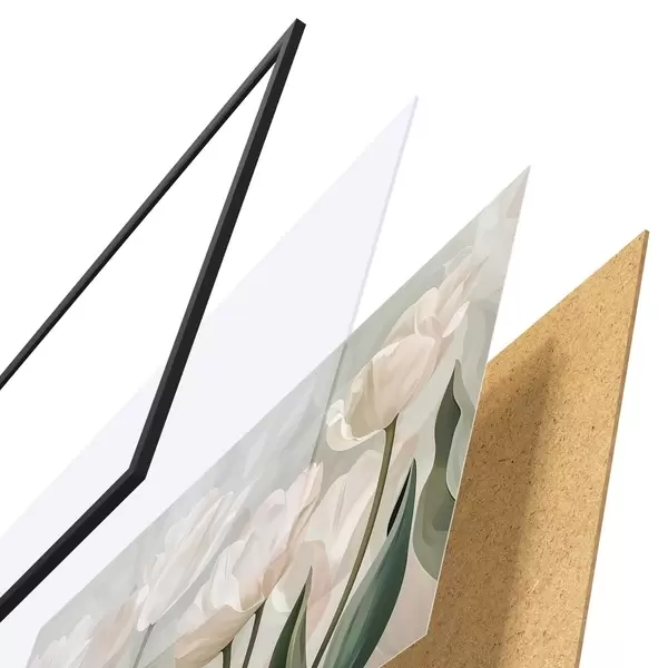 El póster consta de marco, plexiglás, imagen impresa y soporte de aglomerado. El póster puede colgarse inmediatamente en la pared gracias a los soportes de la parte posterior.