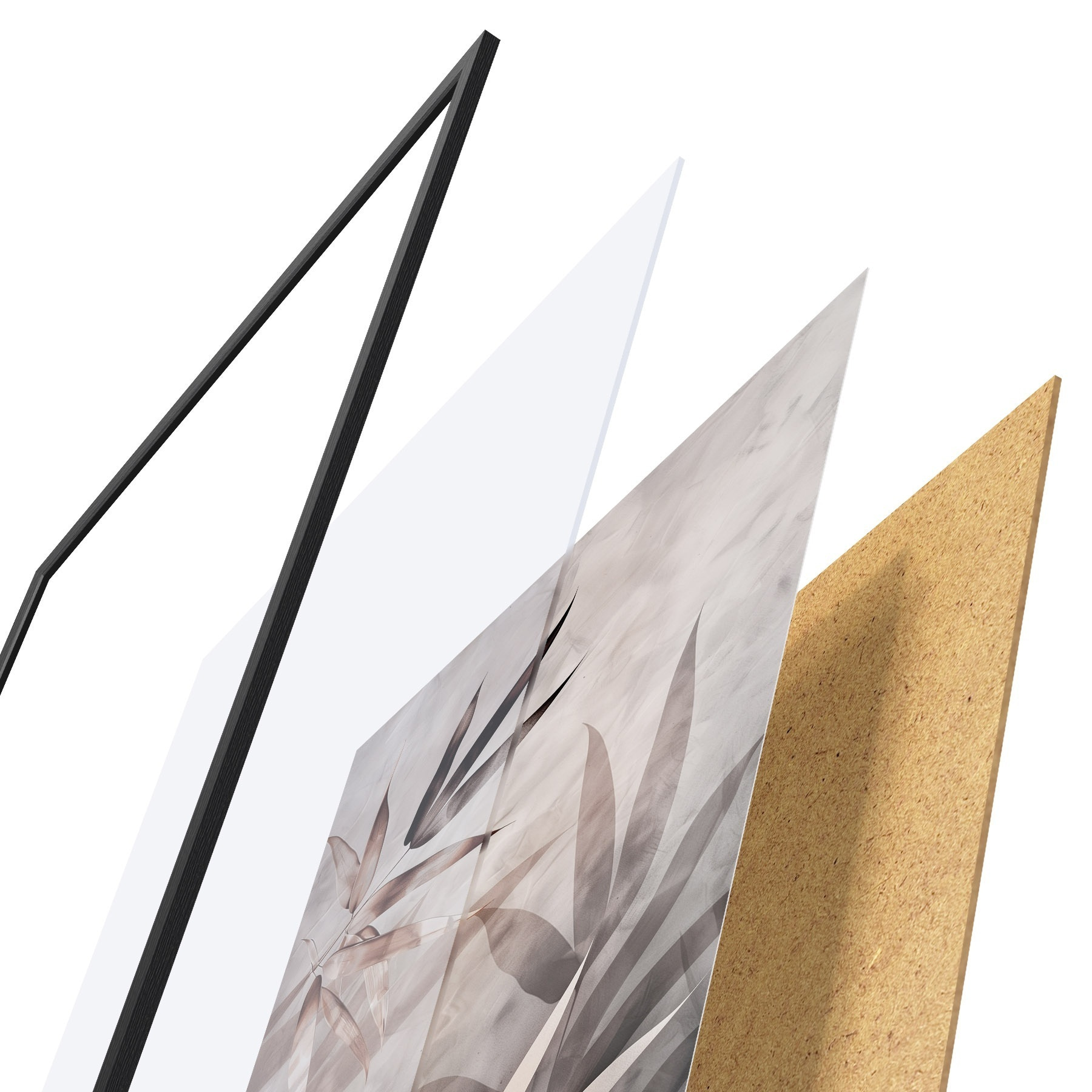 El póster consta de marco, plexiglás, imagen impresa y soporte de aglomerado. El póster puede colgarse inmediatamente en la pared gracias a los soportes de la parte posterior.