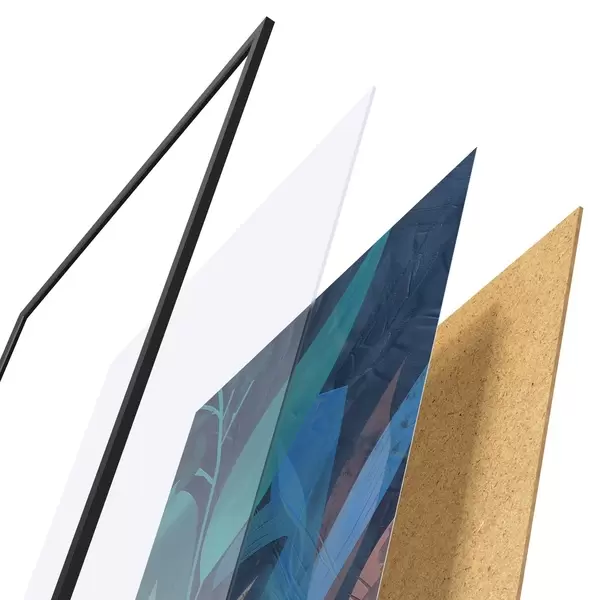 El póster consta de marco, plexiglás, imagen impresa y soporte de aglomerado. El póster puede colgarse inmediatamente en la pared gracias a los soportes de la parte posterior.