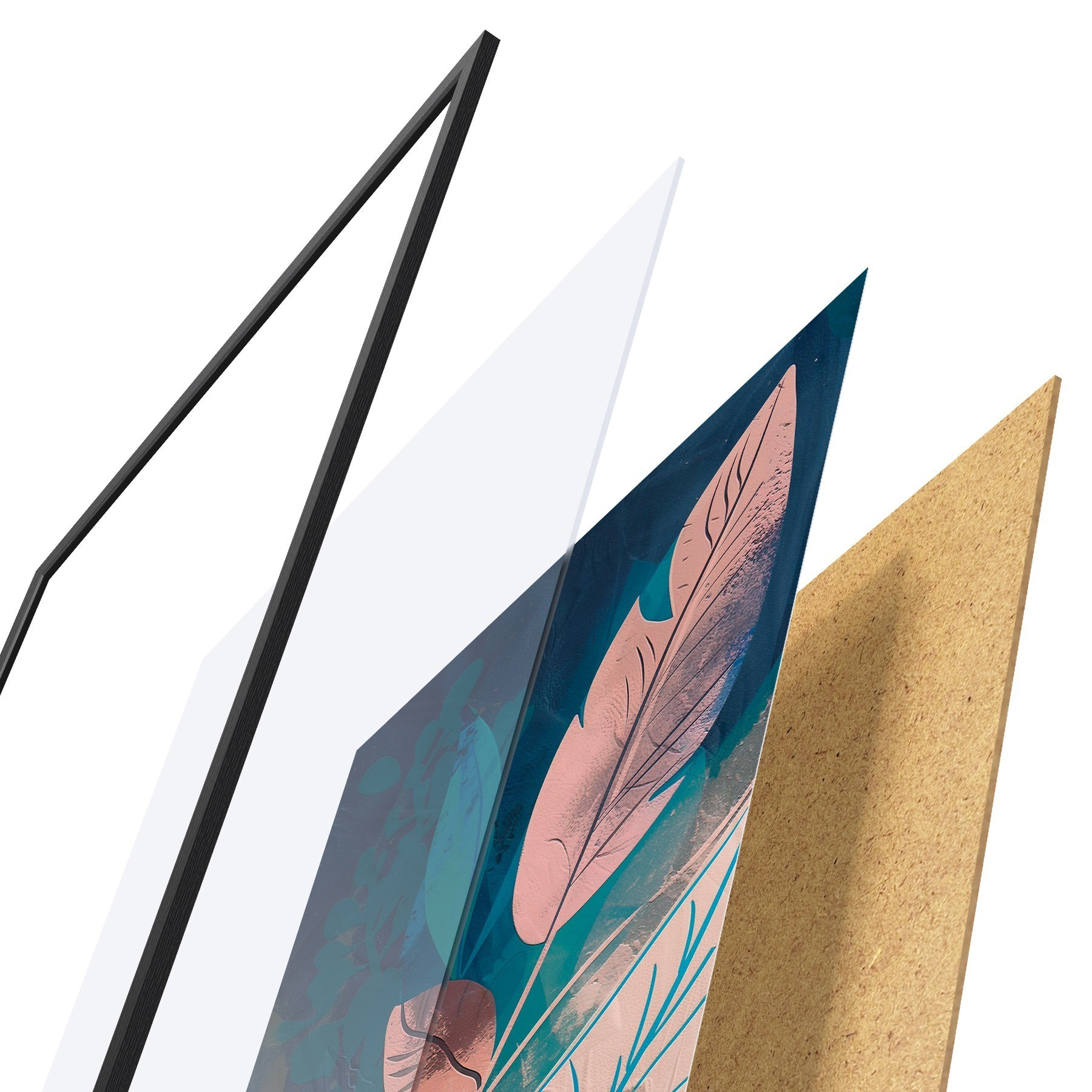 El póster consta de marco, plexiglás, imagen impresa y soporte de aglomerado. El póster puede colgarse inmediatamente en la pared gracias a los soportes de la parte posterior.