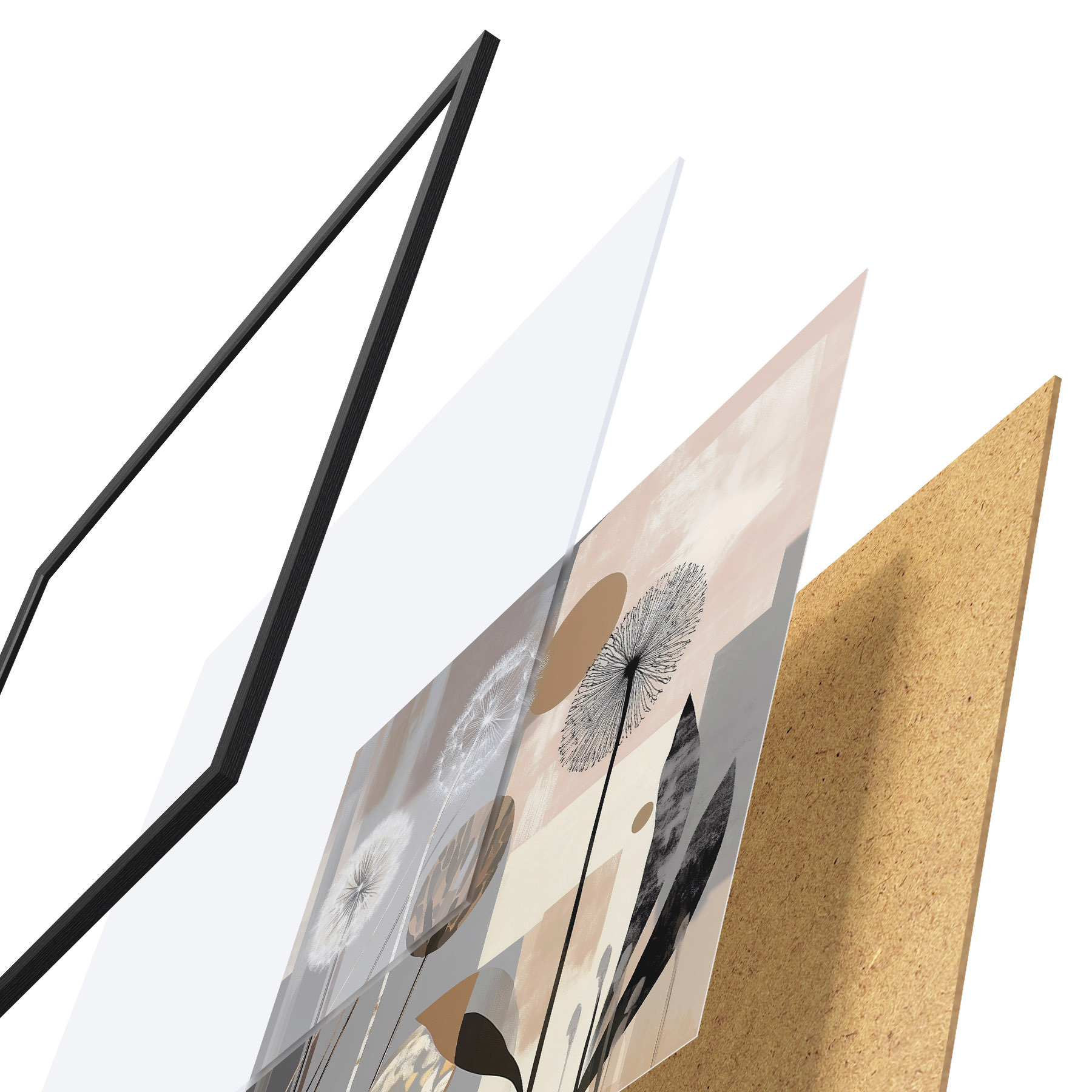 El póster consta de marco, plexiglás, imagen impresa y soporte de aglomerado. El póster puede colgarse inmediatamente en la pared gracias a los soportes de la parte posterior.