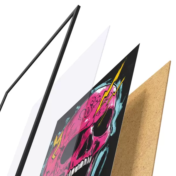 El póster consta de marco, plexiglás, imagen impresa y soporte de aglomerado. El póster puede colgarse inmediatamente en la pared gracias a los soportes de la parte posterior.