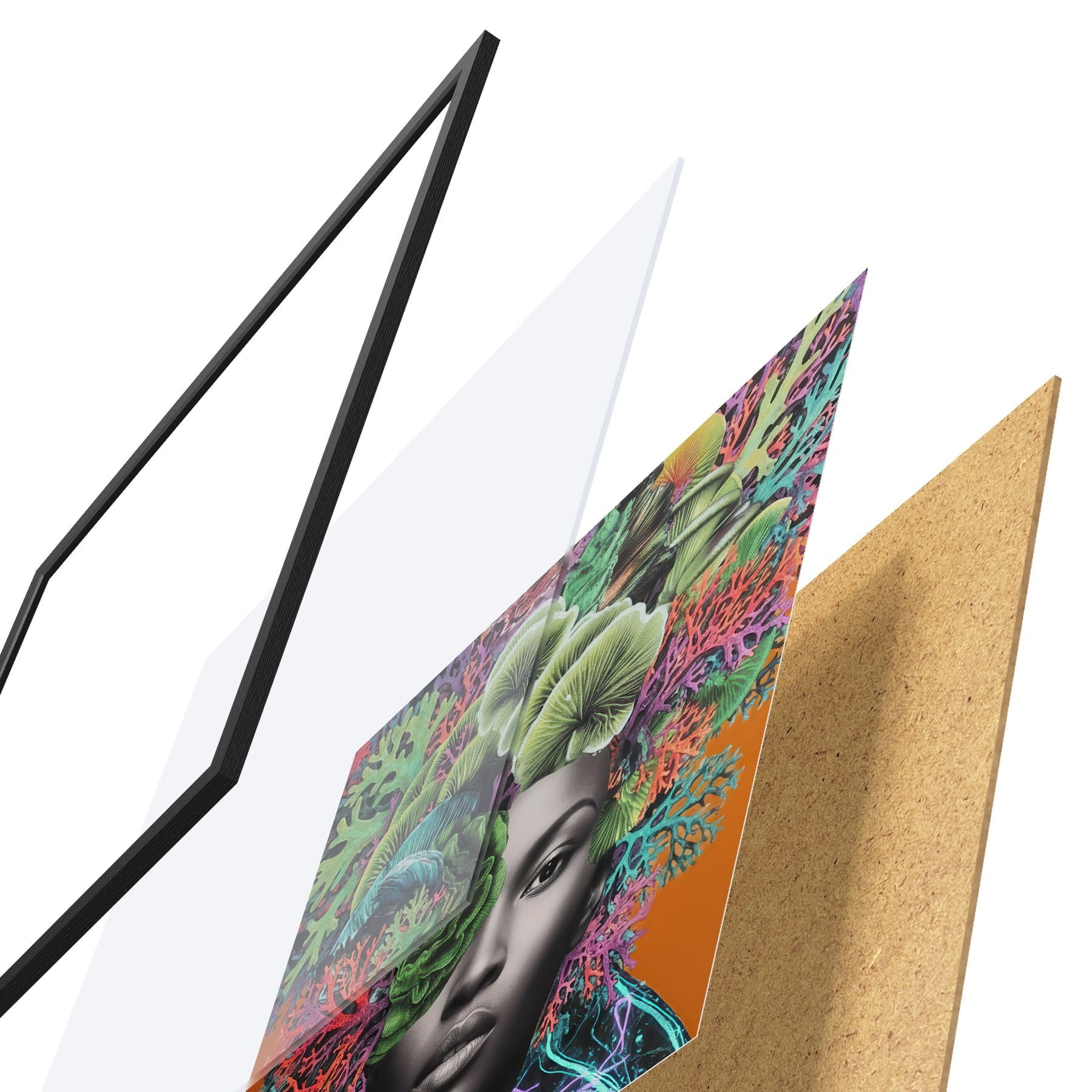 El póster consta de marco, plexiglás, imagen impresa y soporte de aglomerado. El póster puede colgarse inmediatamente en la pared gracias a los soportes de la parte posterior.