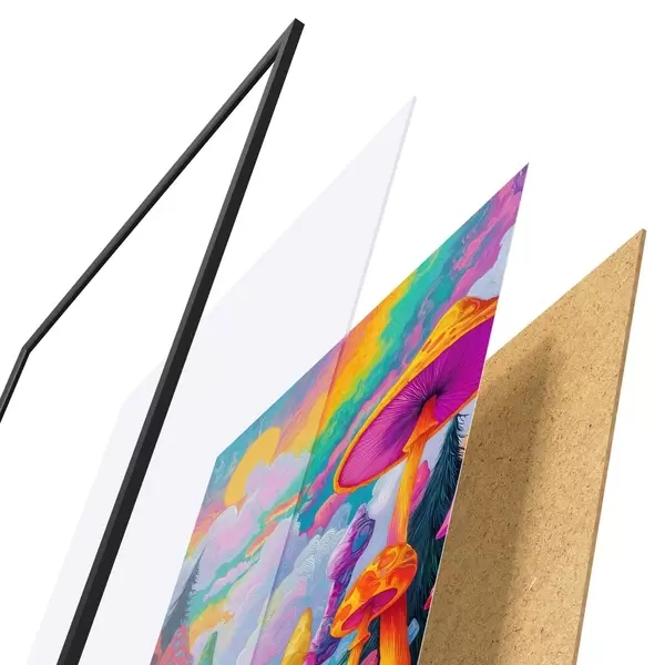 El póster consta de marco, plexiglás, imagen impresa y soporte de aglomerado. El póster puede colgarse inmediatamente en la pared gracias a los soportes de la parte posterior.