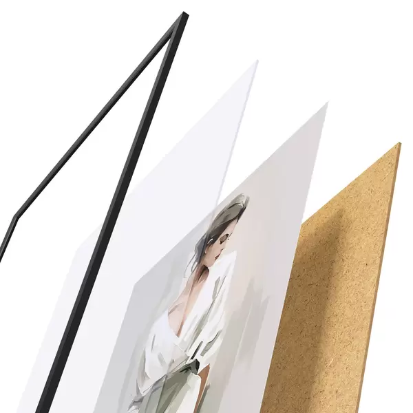 El póster consta de marco, plexiglás, imagen impresa y soporte de aglomerado. El póster puede colgarse inmediatamente en la pared gracias a los soportes de la parte posterior.