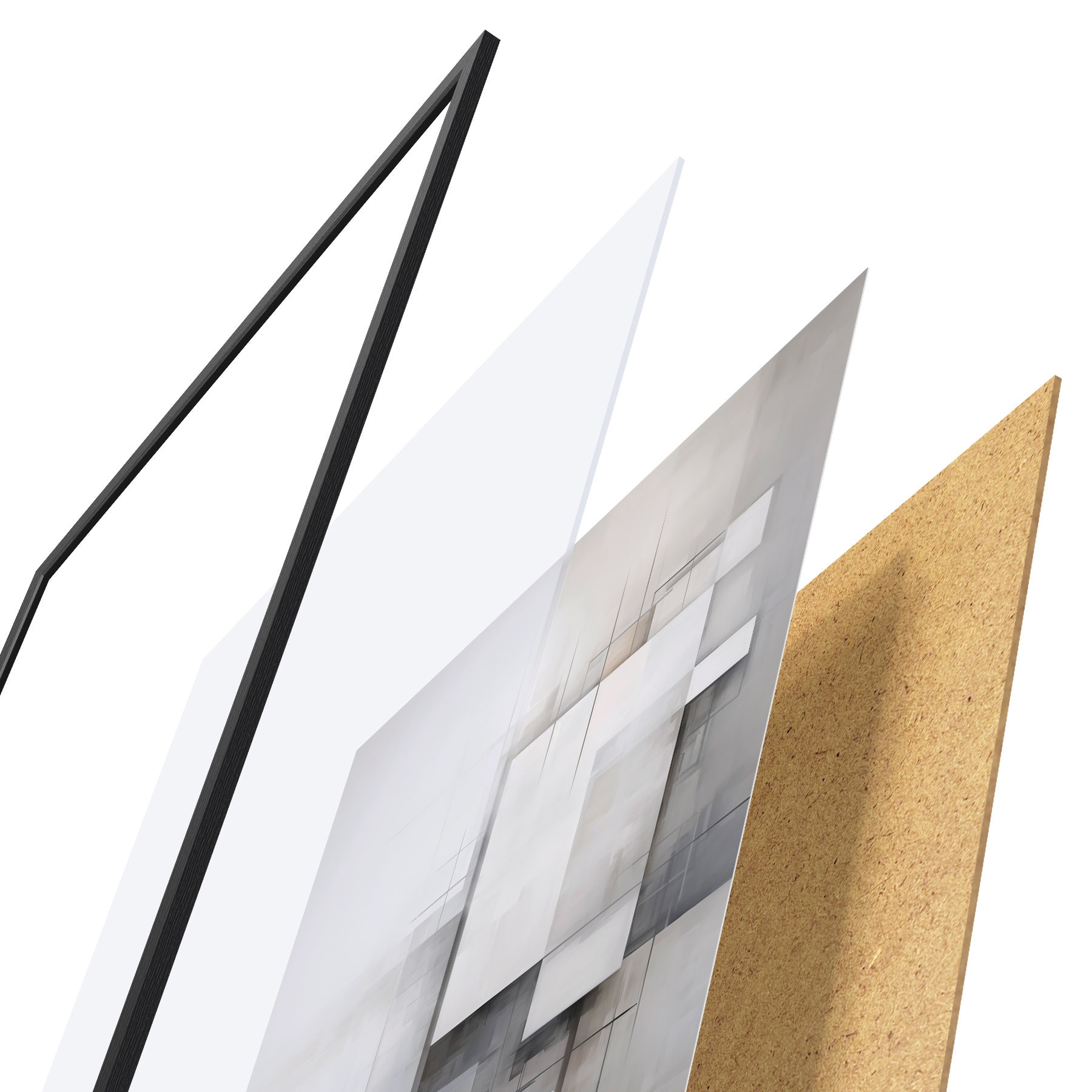 El póster consta de marco, plexiglás, imagen impresa y soporte de aglomerado. El póster puede colgarse inmediatamente en la pared gracias a los soportes de la parte posterior.