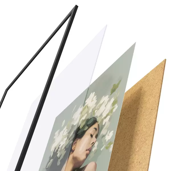 El póster consta de marco, plexiglás, imagen impresa y soporte de aglomerado. El póster puede colgarse inmediatamente en la pared gracias a los soportes de la parte posterior.