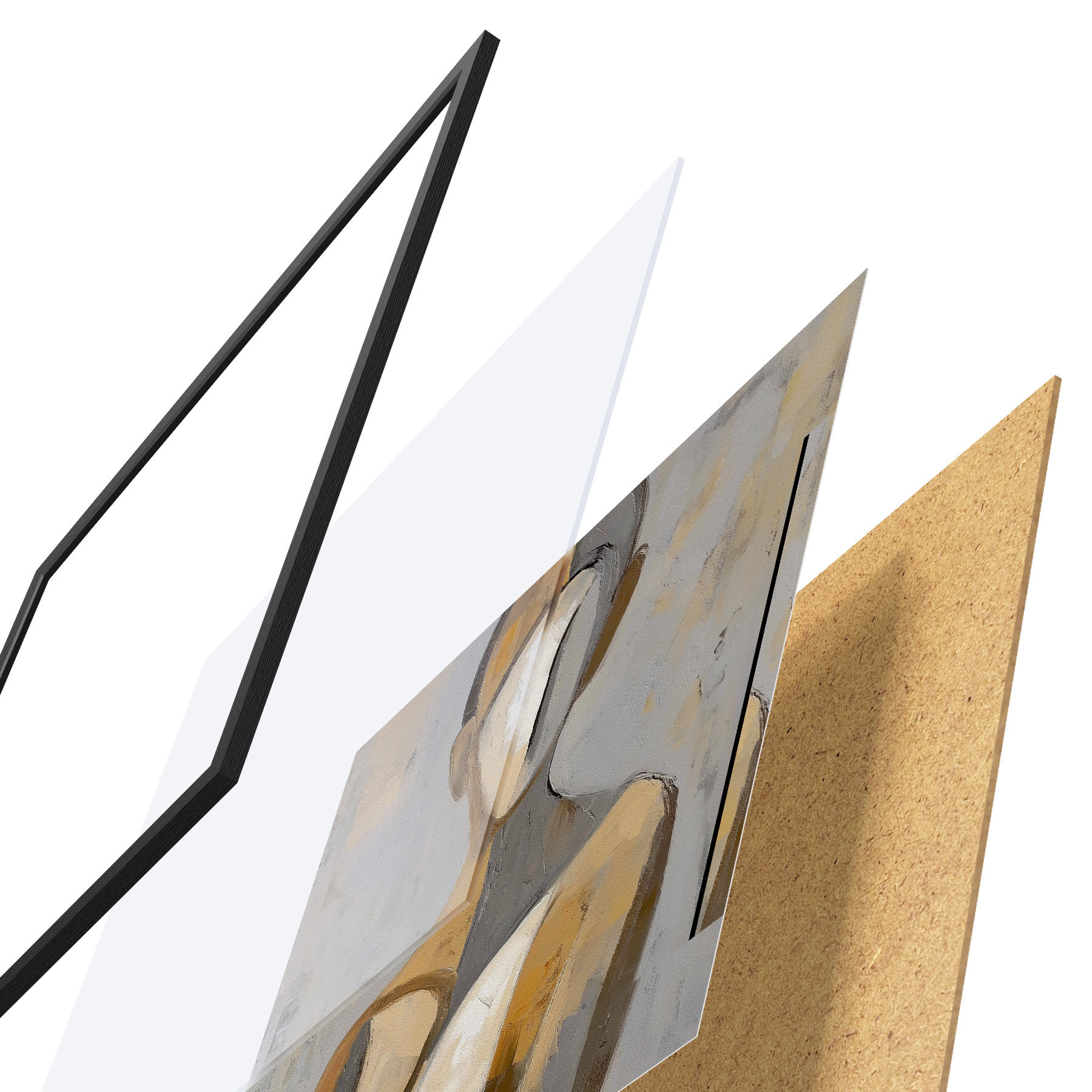 El póster consta de marco, plexiglás, imagen impresa y soporte de aglomerado. El póster puede colgarse inmediatamente en la pared gracias a los soportes de la parte posterior.