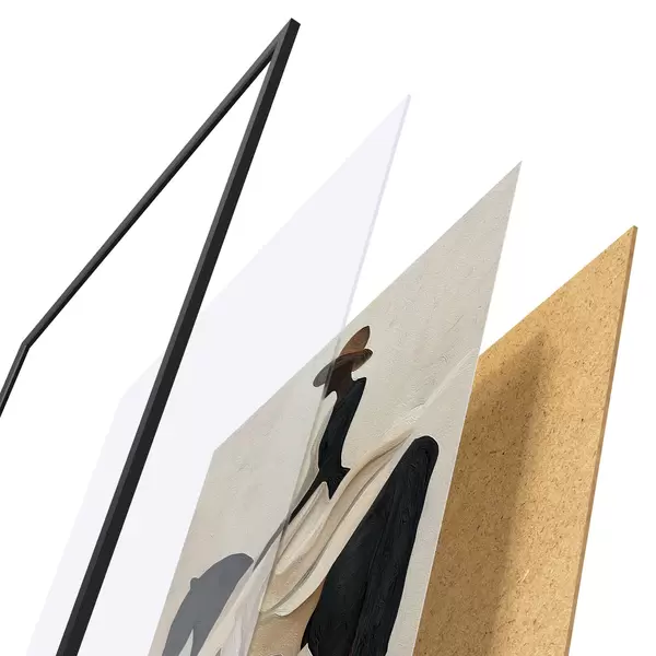 El póster consta de marco, plexiglás, imagen impresa y soporte de aglomerado. El póster puede colgarse inmediatamente en la pared gracias a los soportes de la parte posterior.