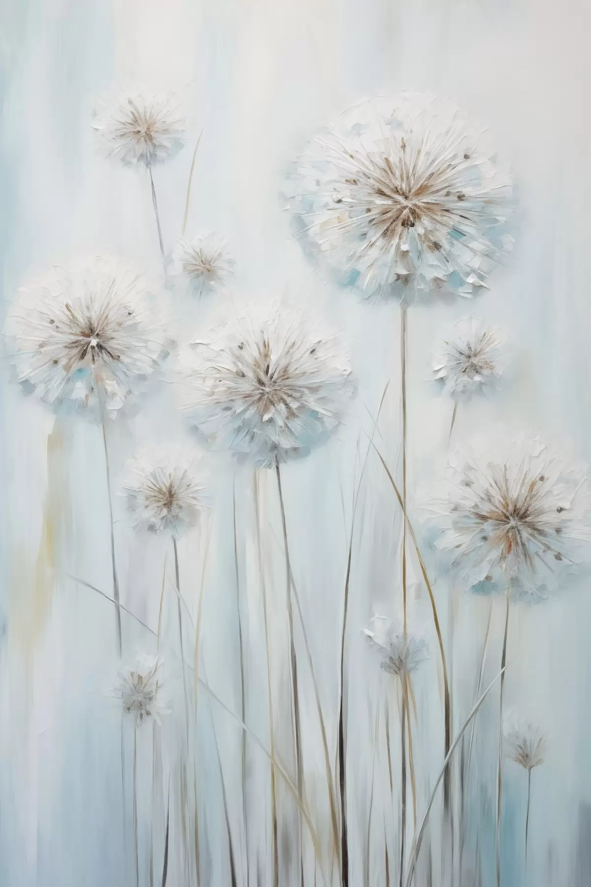 Poster Estilo pictórico texturizado de dientes de león sobre un fondo azul y blanco suave. Nr f47856