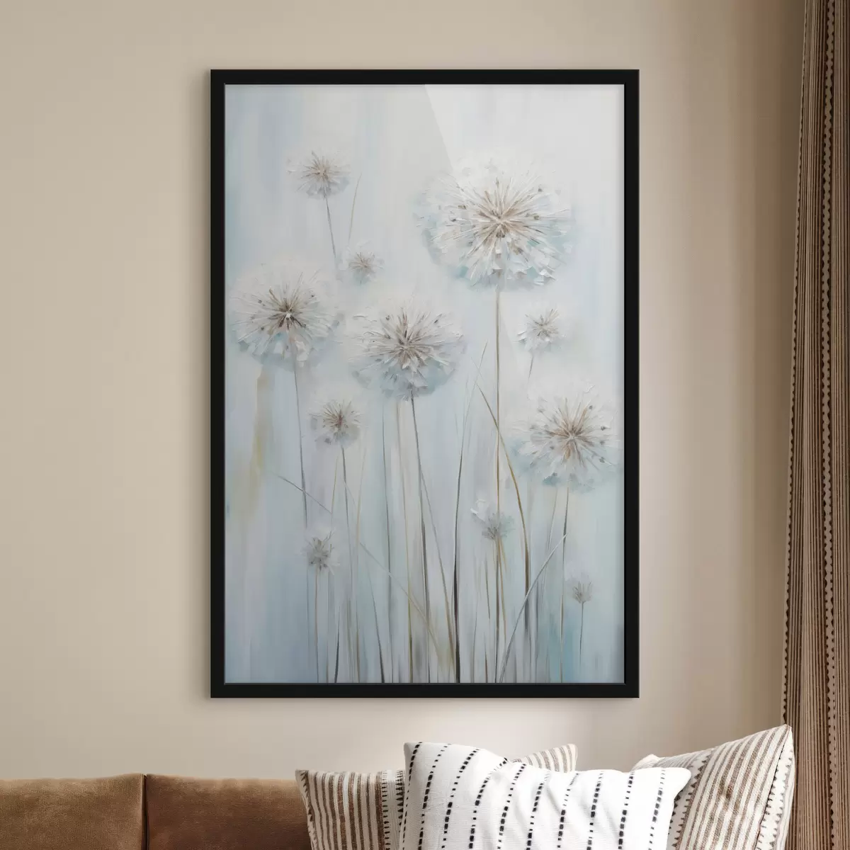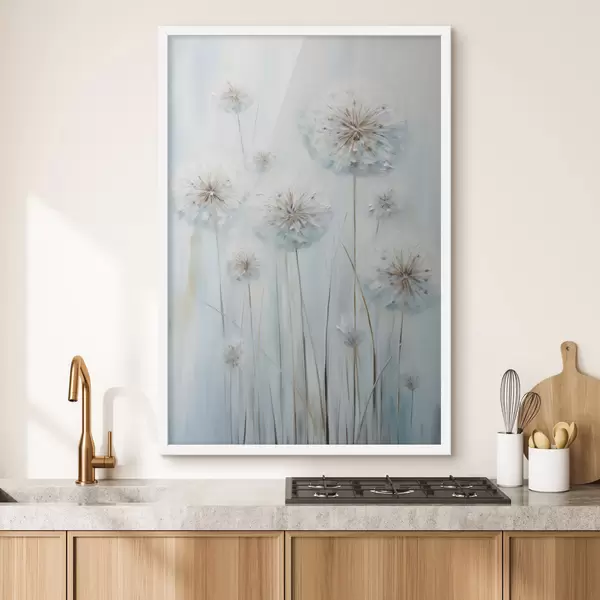 Poster Estilo pictórico texturizado de dientes de león sobre un fondo azul y blanco suave. f47856