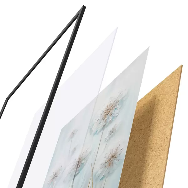 El póster consta de marco, plexiglás, imagen impresa y soporte de aglomerado. El póster puede colgarse inmediatamente en la pared gracias a los soportes de la parte posterior.