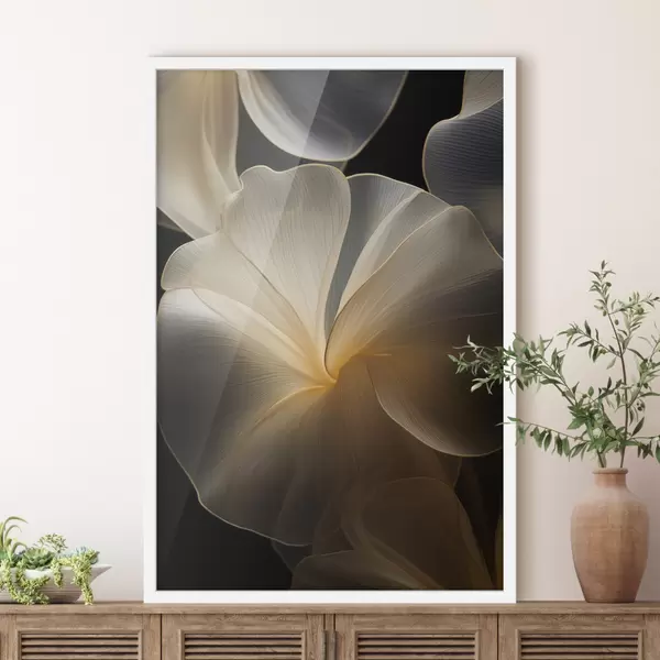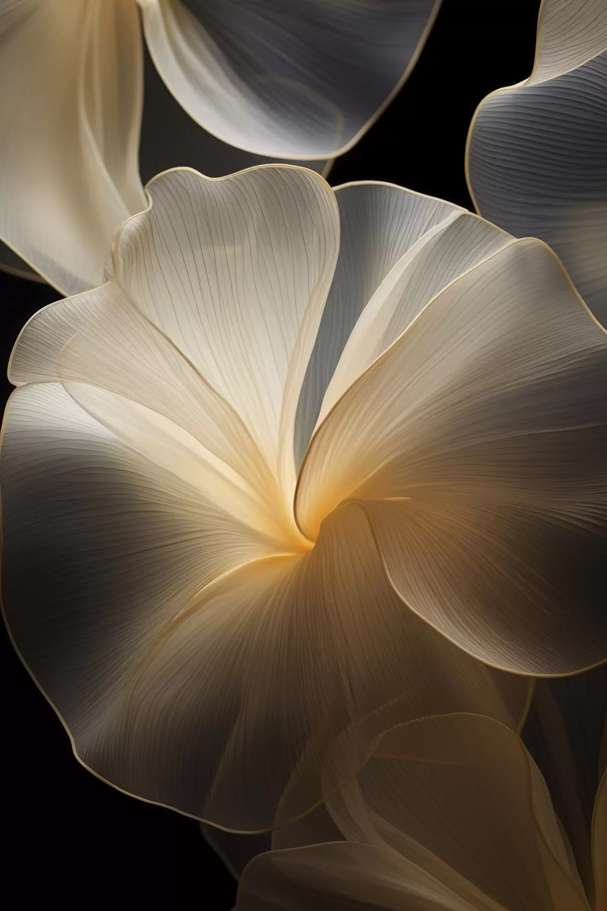 Poster Pétalos abstractos fluidos y translúcidos con líneas delicadas, sobre un fondo oscuro. Nr f47860