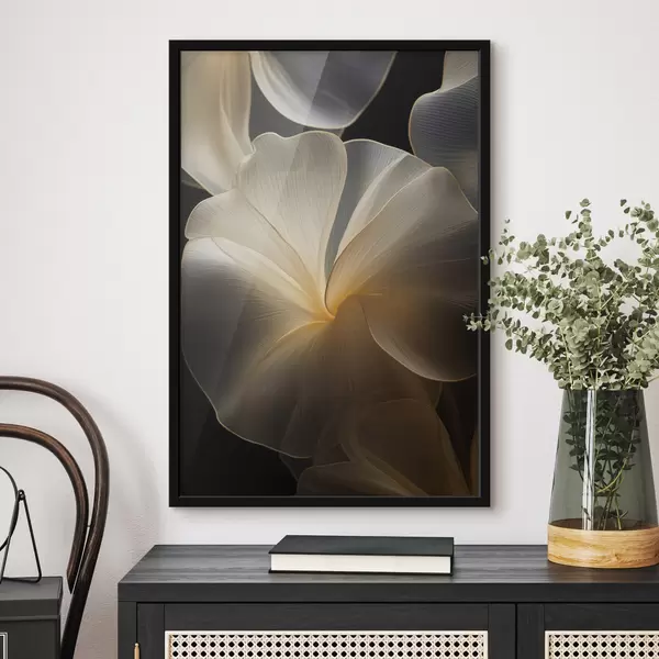 Poster Pétalos abstractos fluidos y translúcidos con líneas delicadas, sobre un fondo oscuro. f47860