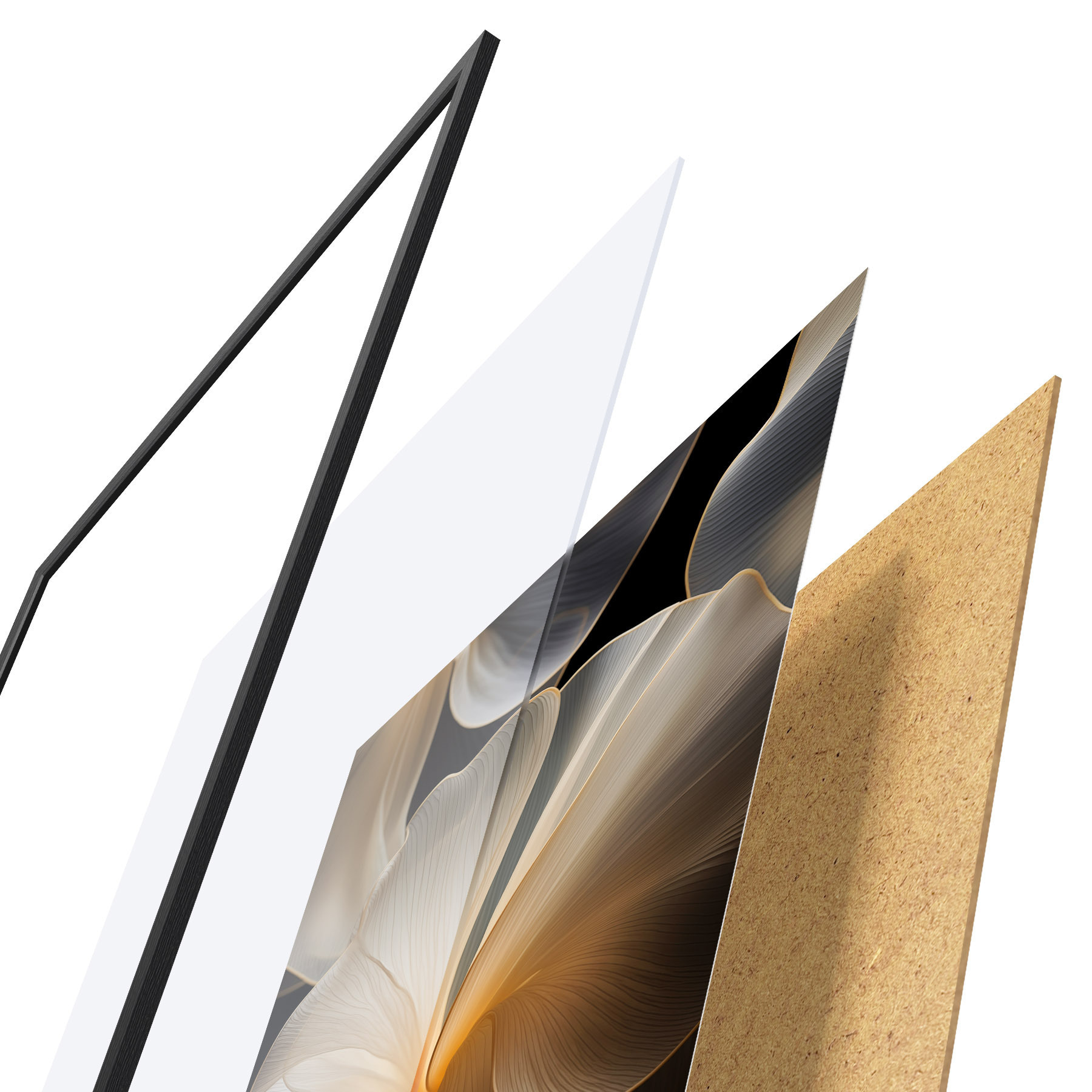 El póster consta de marco, plexiglás, imagen impresa y soporte de aglomerado. El póster puede colgarse inmediatamente en la pared gracias a los soportes de la parte posterior.