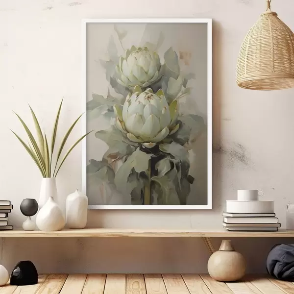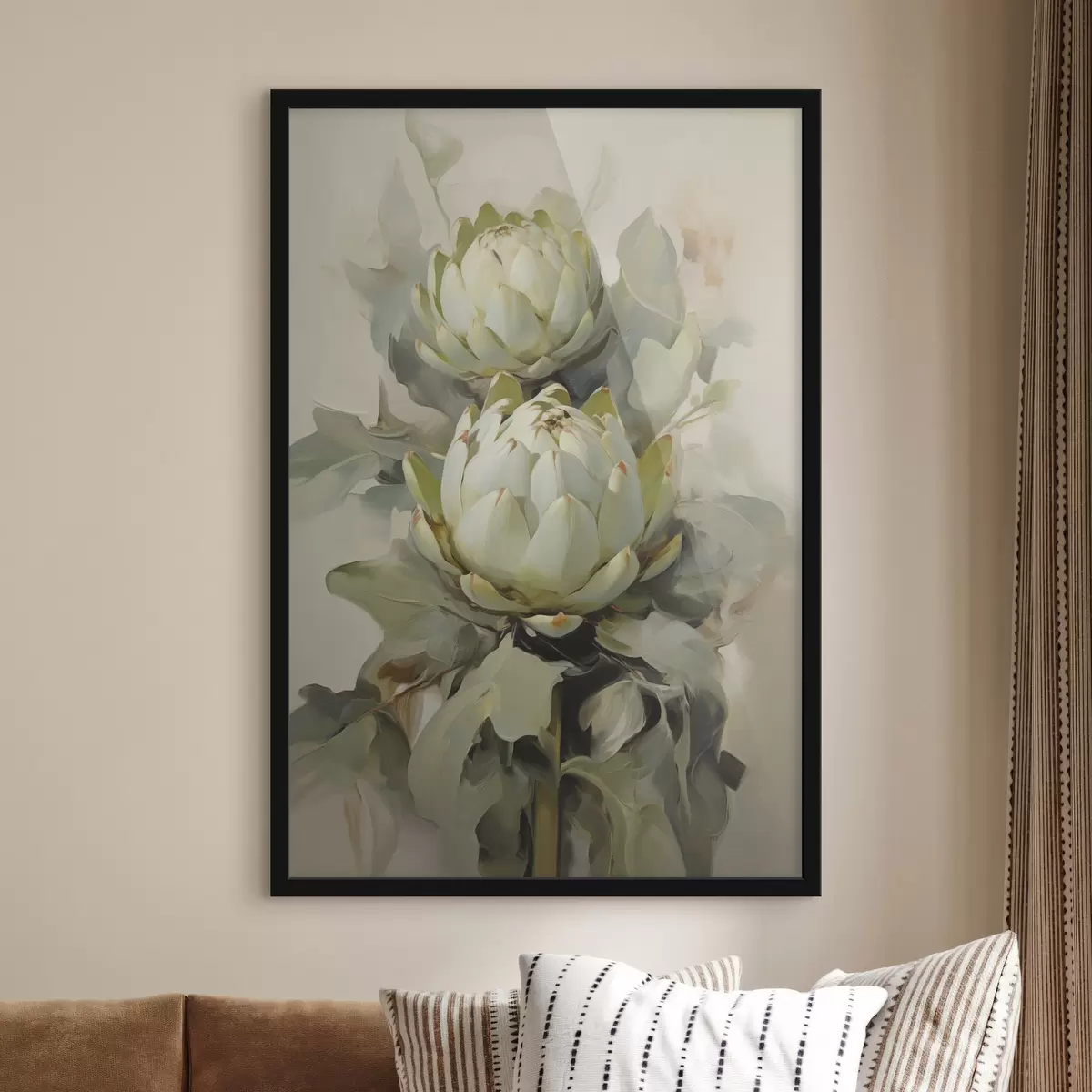 Poster Estilo pictórico de varias flores blancas de protea con grandes hojas verdes sobre un fondo claro. f47862