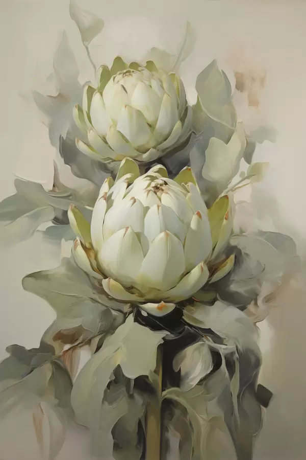 Poster Estilo pictórico de varias flores blancas de protea con grandes hojas verdes sobre un fondo claro. f47862