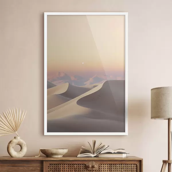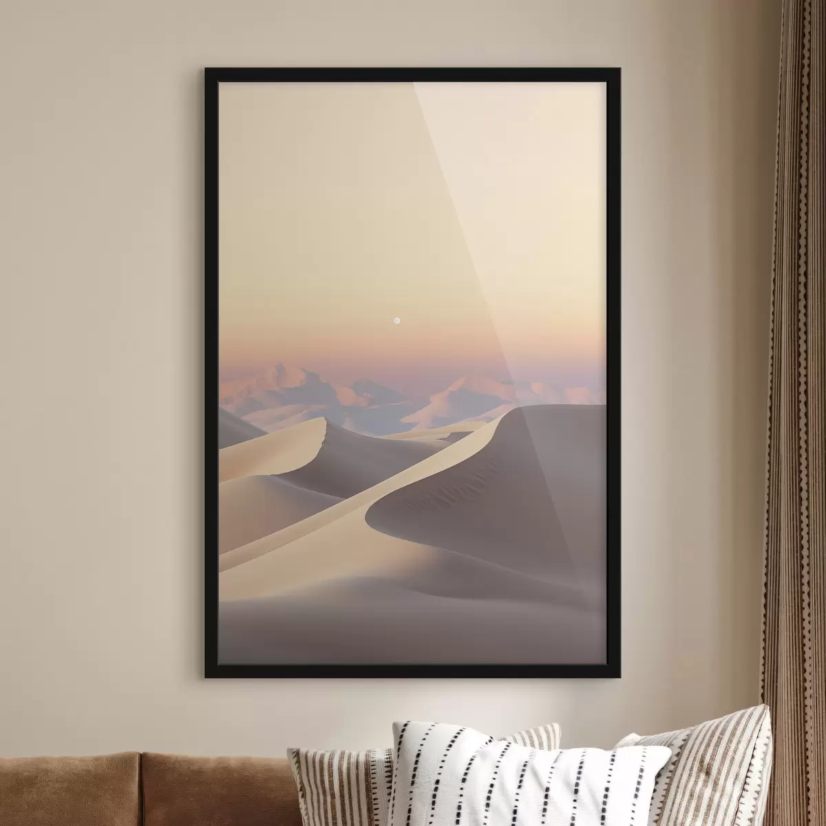 Poster Un paisaje desértico con dunas onduladas bajo un cielo de suaves tonos pastel, con montañas lejanas al fondo. f47865