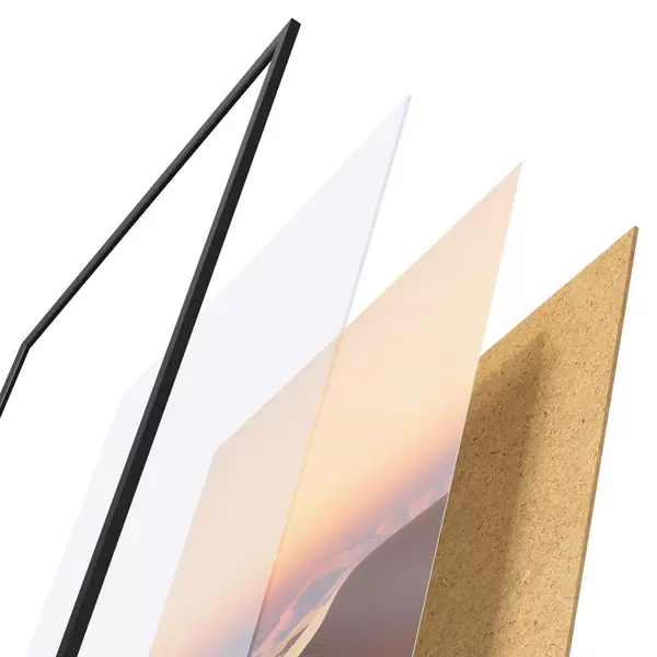 El póster consta de marco, plexiglás, imagen impresa y soporte de aglomerado. El póster puede colgarse inmediatamente en la pared gracias a los soportes de la parte posterior.