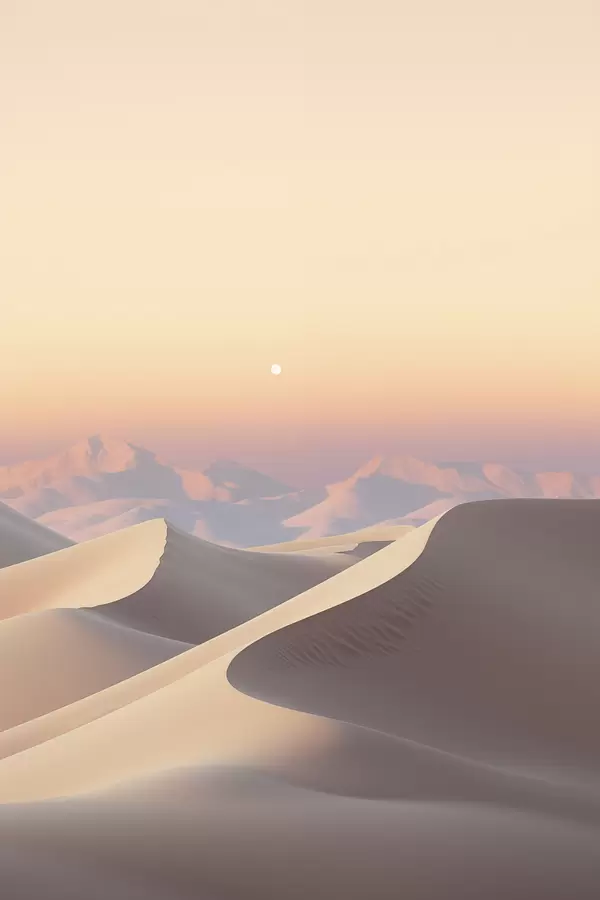 Poster Un paisaje desértico con dunas onduladas bajo un cielo de suaves tonos pastel, con montañas lejanas al fondo. f47865