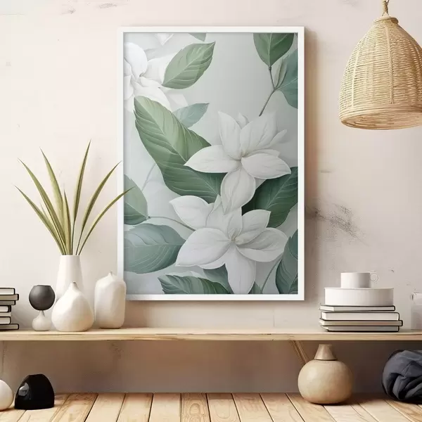 Poster Flores blancas con hojas verdes, fondo pastel Nr f47869