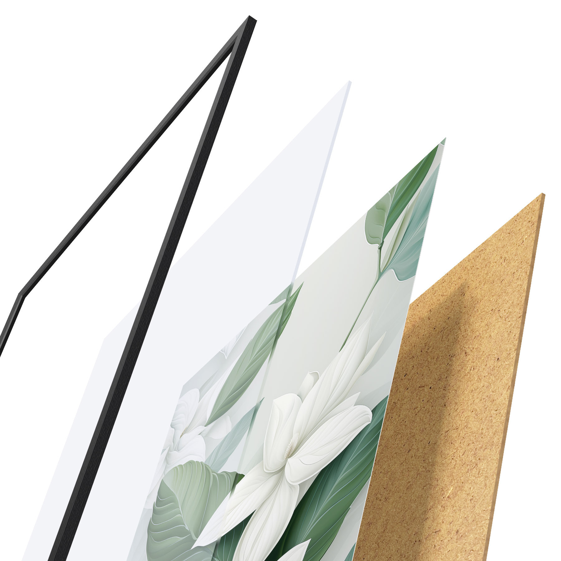 El póster consta de marco, plexiglás, imagen impresa y soporte de aglomerado. El póster puede colgarse inmediatamente en la pared gracias a los soportes de la parte posterior.