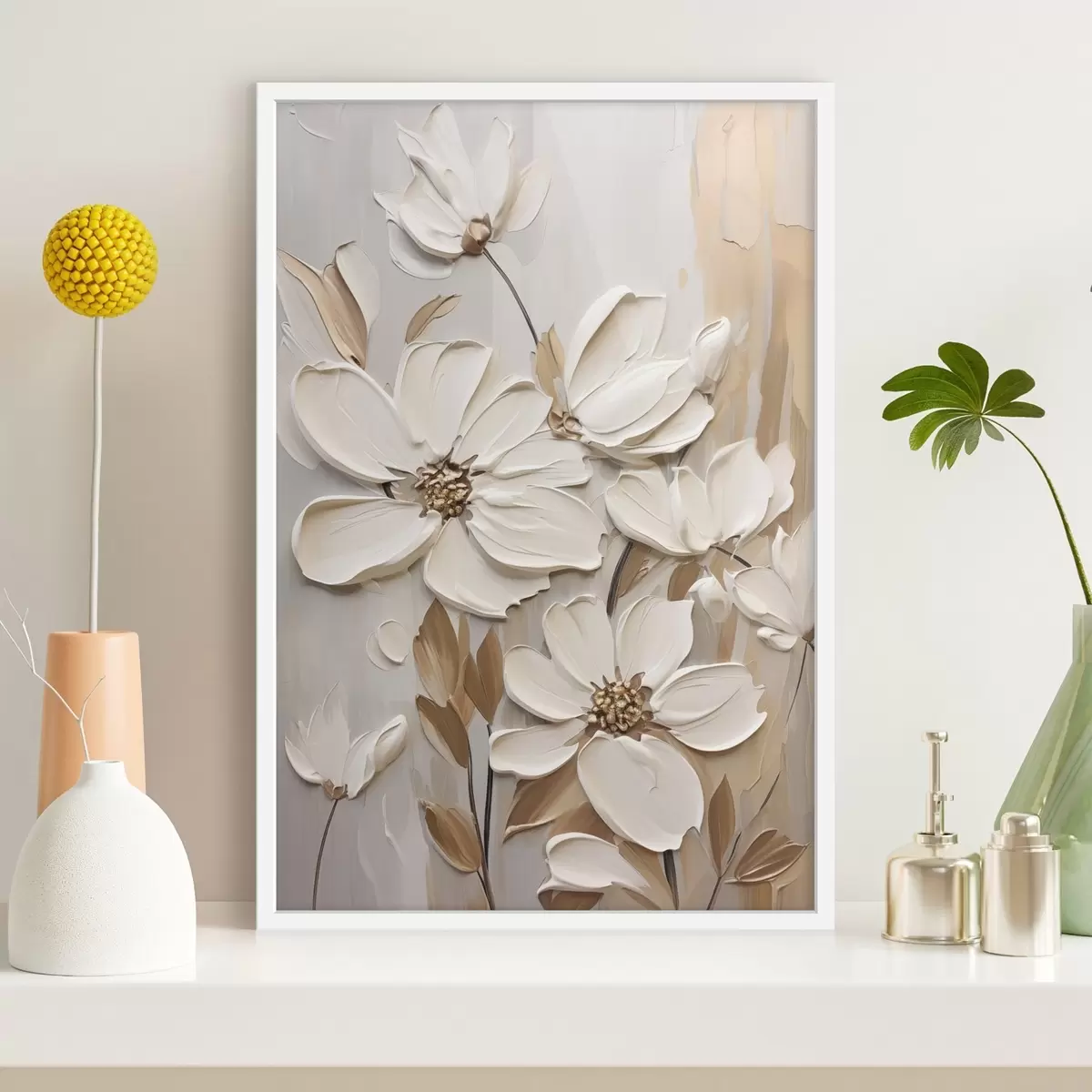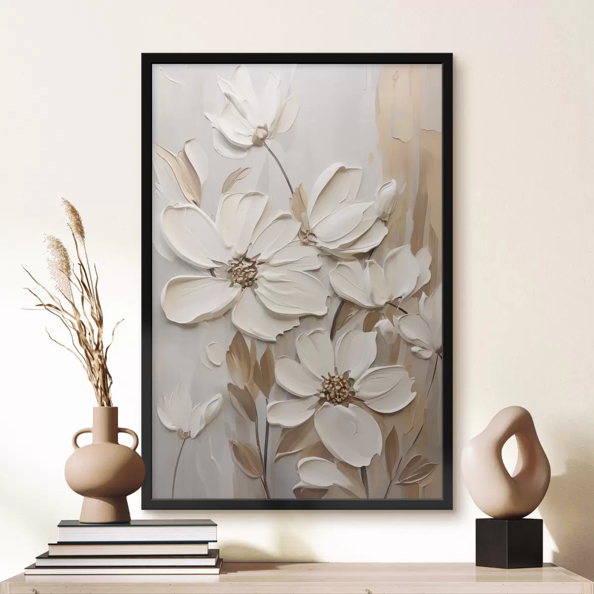 Poster Flores blancas abstractas con pétalos texturizados, sobre un fondo neutro con sutiles pinceladas imitativas. f47873