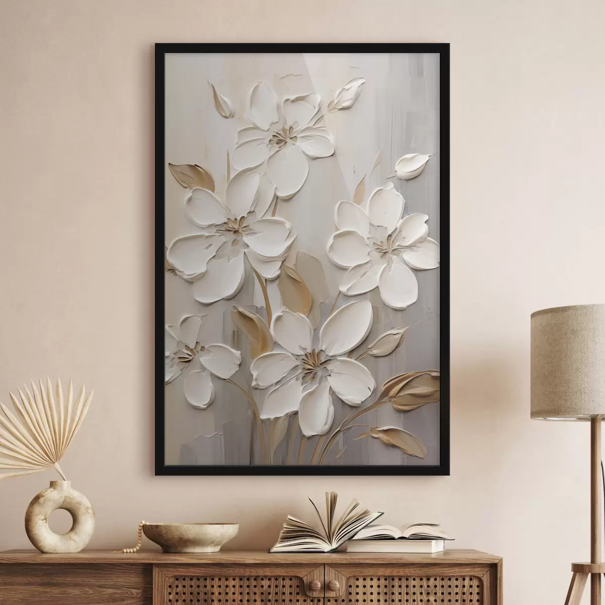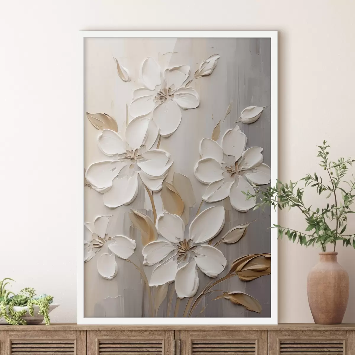 Poster Flores blancas abstractas con pétalos texturizados, sobre un fondo neutro con sutiles pinceladas imitativas. f47874