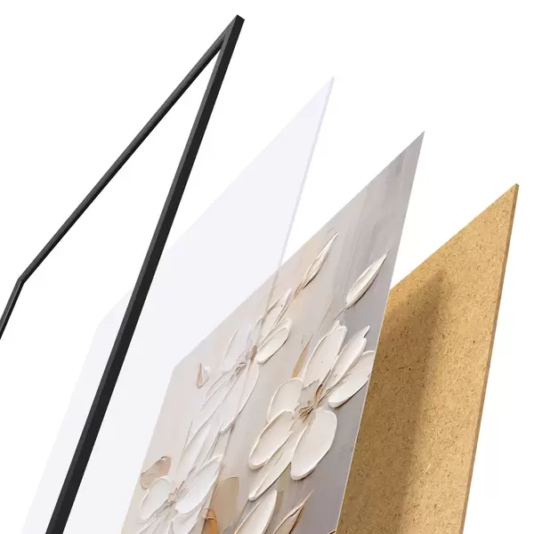 El póster consta de marco, plexiglás, imagen impresa y soporte de aglomerado. El póster puede colgarse inmediatamente en la pared gracias a los soportes de la parte posterior.