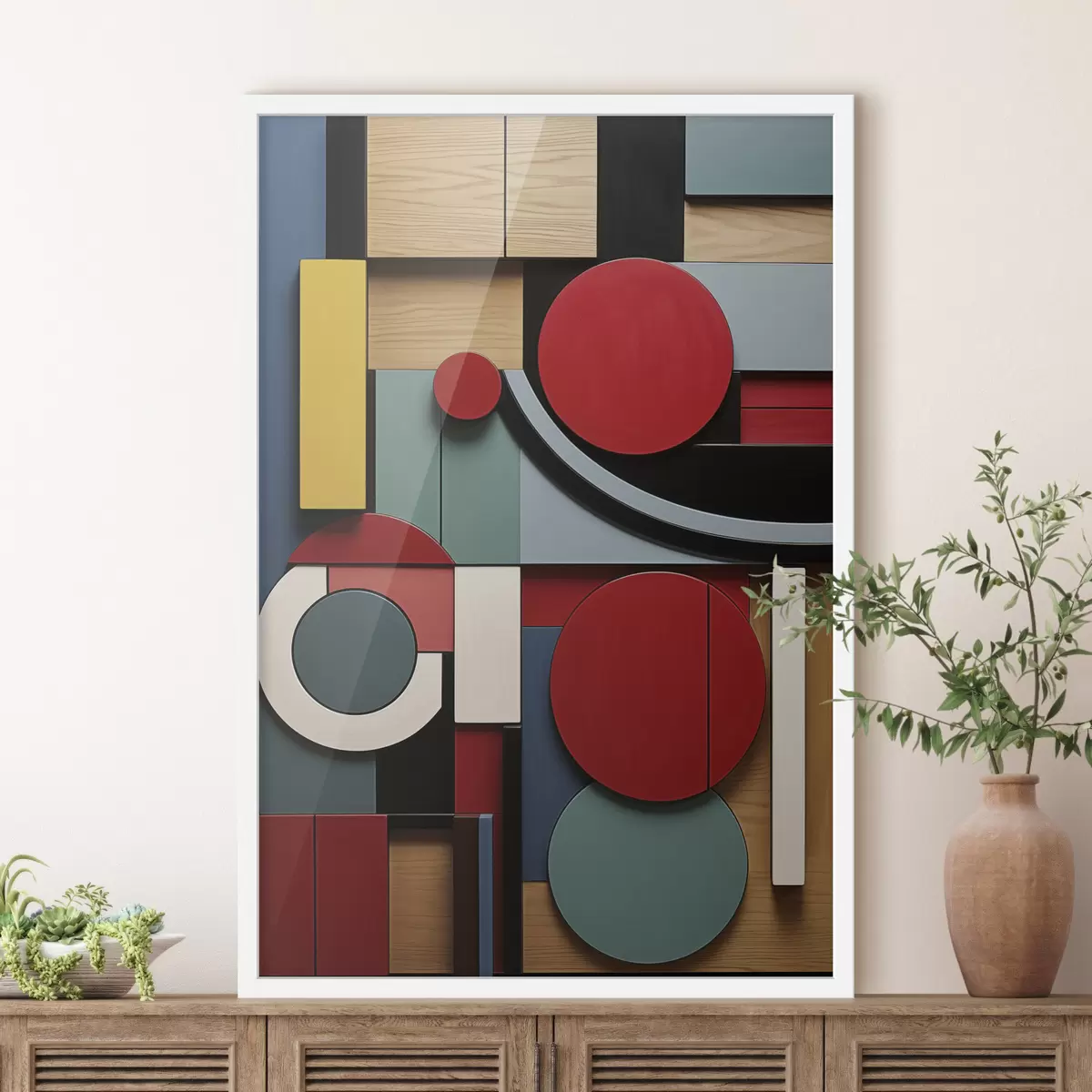 Poster Composición geométrica abstracta con imitación de textura de madera, rectángulos y círculos rojos, negros, blancos y verde azulado. Nr f47876