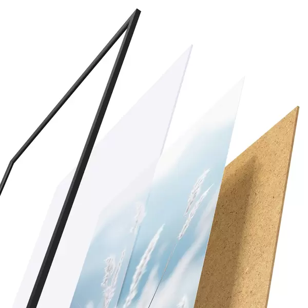 El póster consta de marco, plexiglás, imagen impresa y soporte de aglomerado. El póster puede colgarse inmediatamente en la pared gracias a los soportes de la parte posterior.