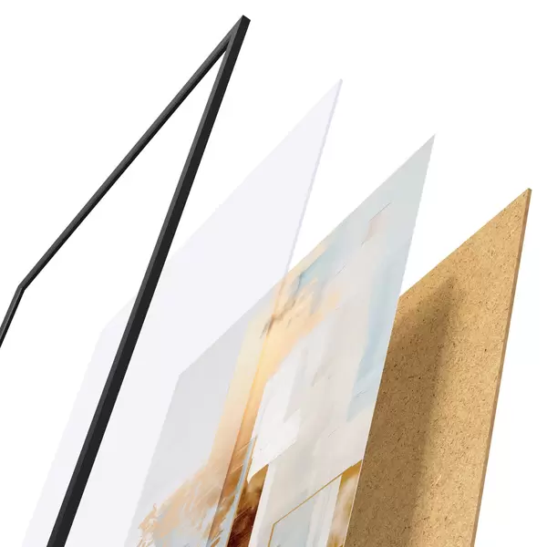El póster consta de marco, plexiglás, imagen impresa y soporte de aglomerado. El póster puede colgarse inmediatamente en la pared gracias a los soportes de la parte posterior.