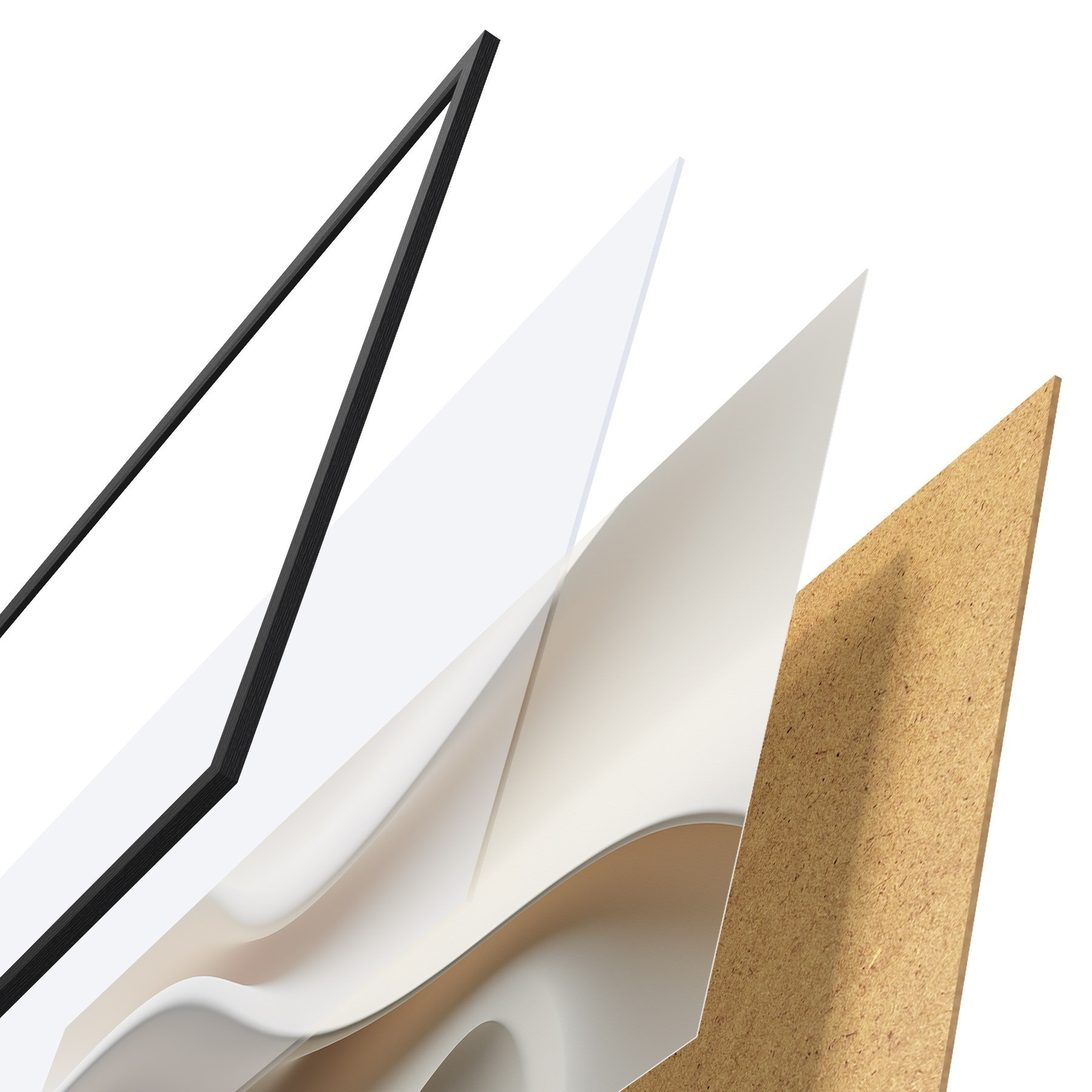 El póster consta de marco, plexiglás, imagen impresa y soporte de aglomerado. El póster puede colgarse inmediatamente en la pared gracias a los soportes de la parte posterior.