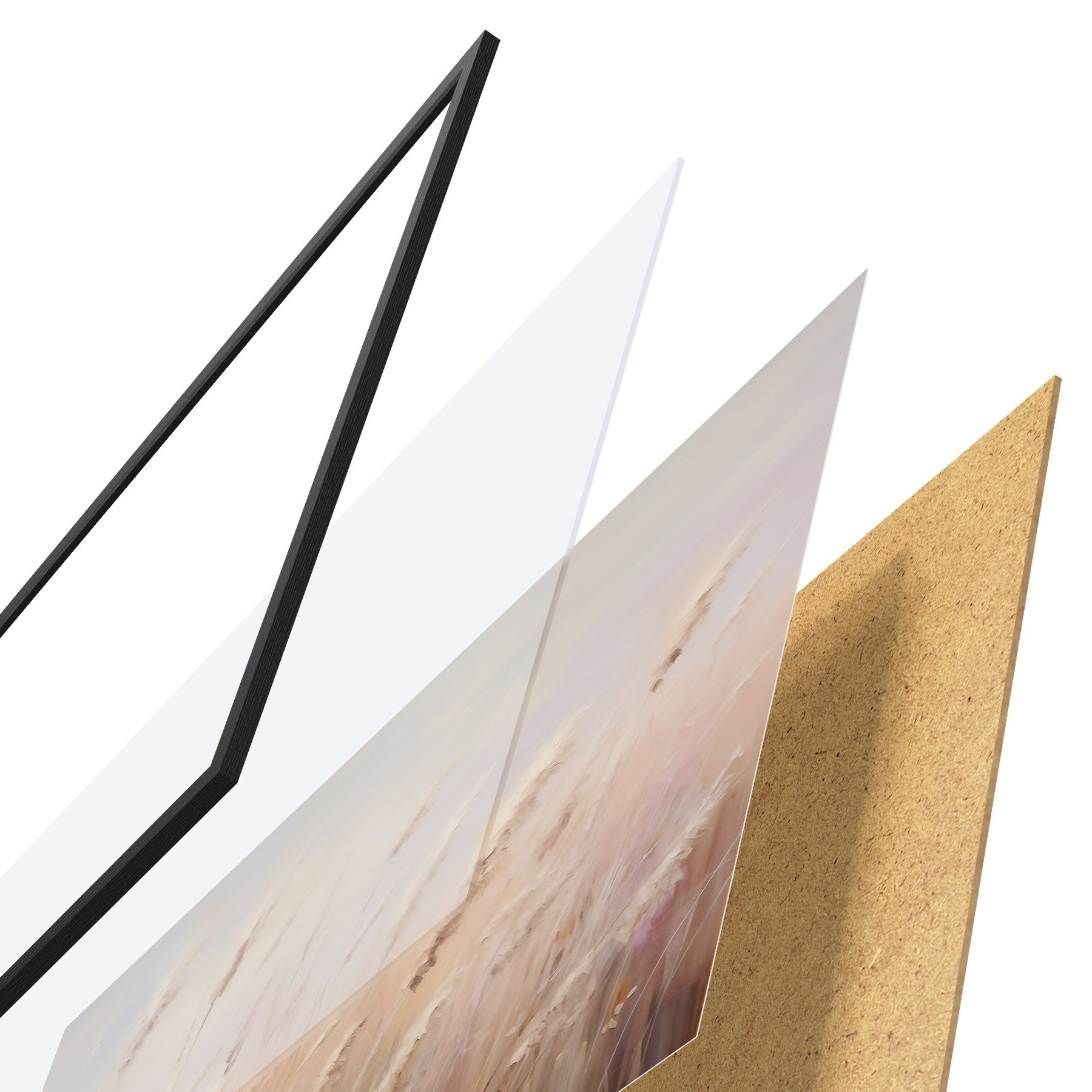 El póster consta de marco, plexiglás, imagen impresa y soporte de aglomerado. El póster puede colgarse inmediatamente en la pared gracias a los soportes de la parte posterior.