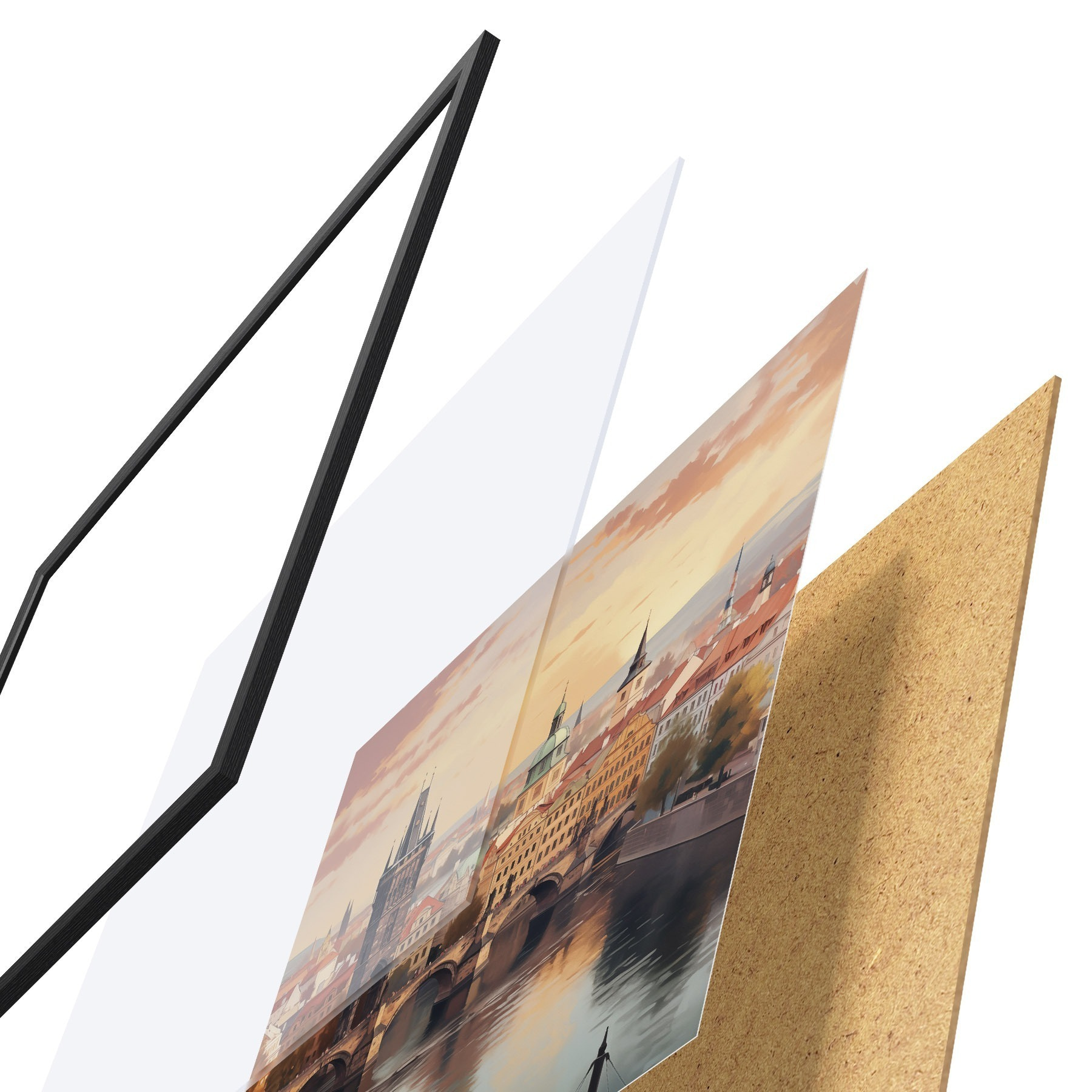 El póster consta de marco, plexiglás, imagen impresa y soporte de aglomerado. El póster puede colgarse inmediatamente en la pared gracias a los soportes de la parte posterior.