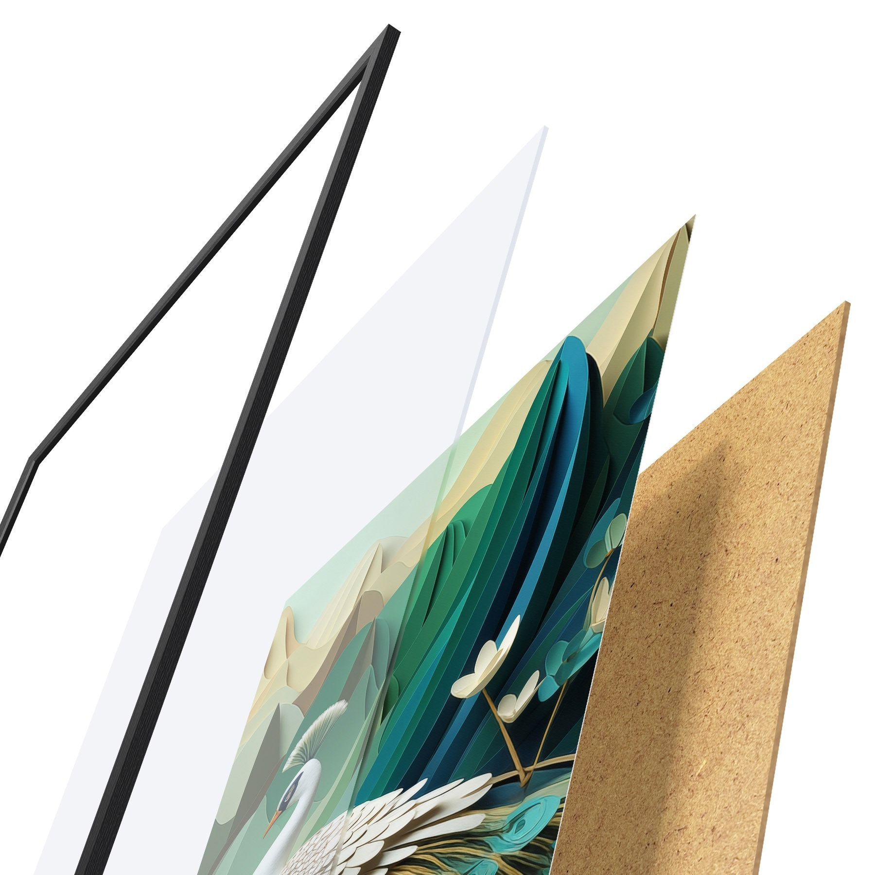 El póster consta de marco, plexiglás, imagen impresa y soporte de aglomerado. El póster puede colgarse inmediatamente en la pared gracias a los soportes de la parte posterior.