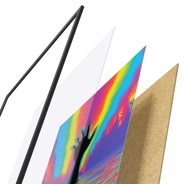 El póster consta de marco, plexiglás, imagen impresa y soporte de aglomerado. El póster puede colgarse inmediatamente en la pared gracias a los soportes de la parte posterior.