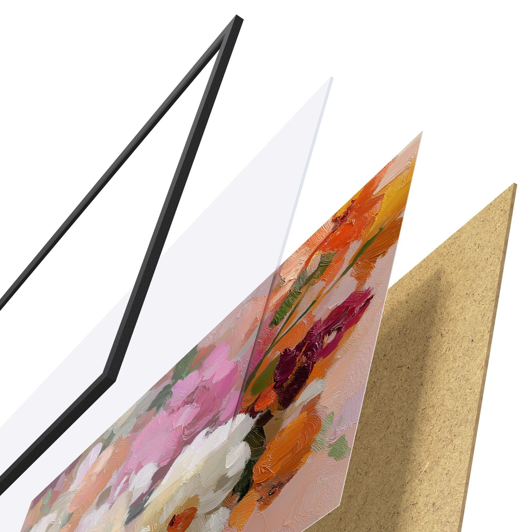 El póster consta de marco, plexiglás, imagen impresa y soporte de aglomerado. El póster puede colgarse inmediatamente en la pared gracias a los soportes de la parte posterior.