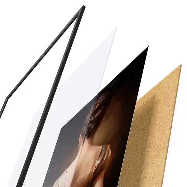El póster consta de marco, plexiglás, imagen impresa y soporte de aglomerado. El póster puede colgarse inmediatamente en la pared gracias a los soportes de la parte posterior.