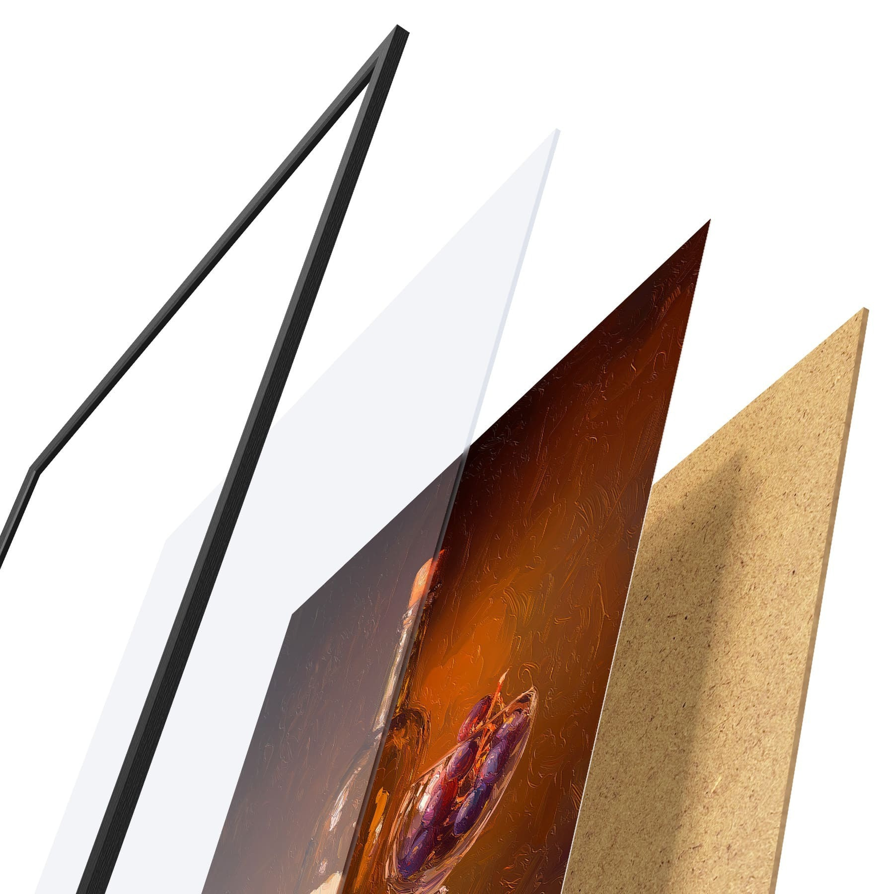 El póster consta de marco, plexiglás, imagen impresa y soporte de aglomerado. El póster puede colgarse inmediatamente en la pared gracias a los soportes de la parte posterior.