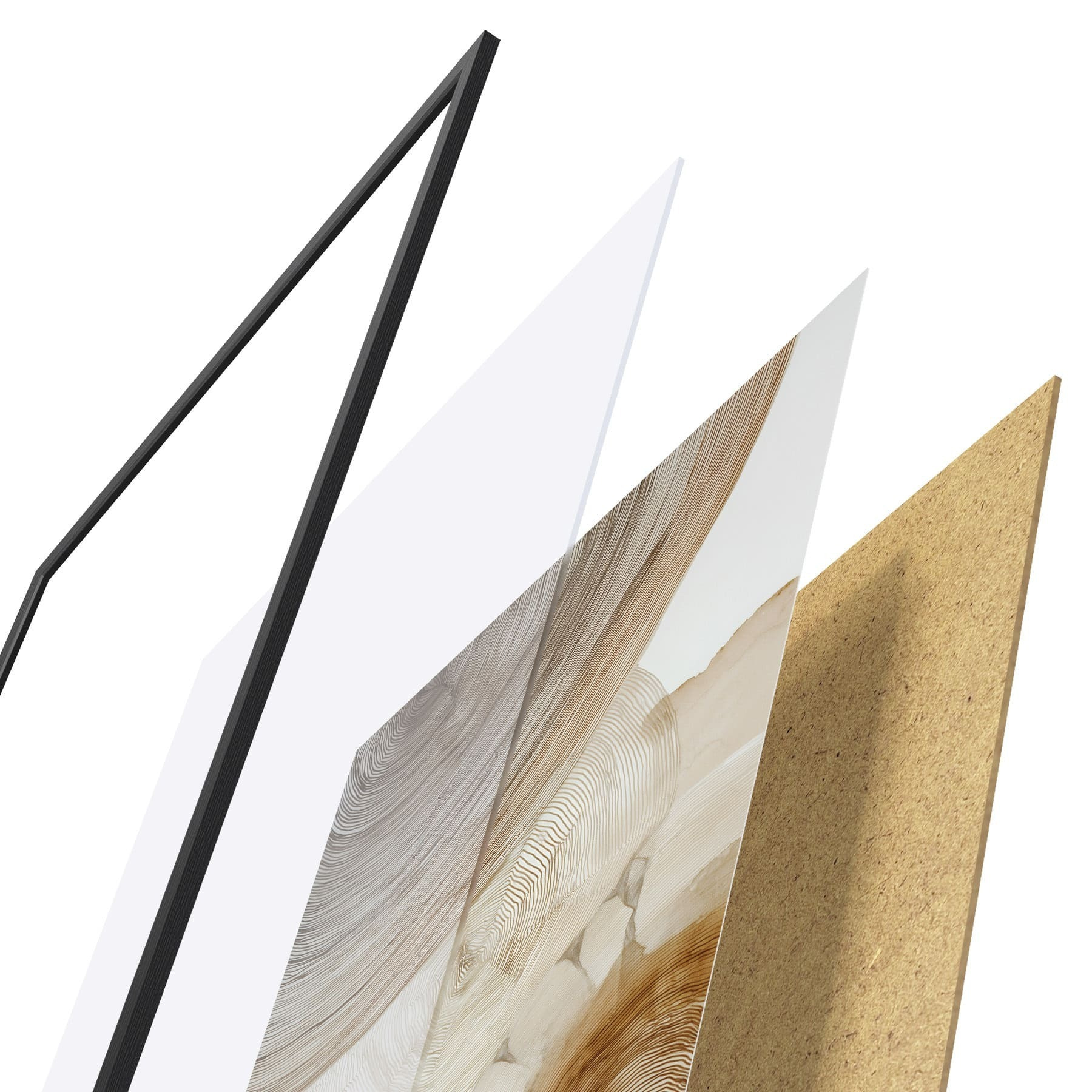 El póster consta de marco, plexiglás, imagen impresa y soporte de aglomerado. El póster puede colgarse inmediatamente en la pared gracias a los soportes de la parte posterior.