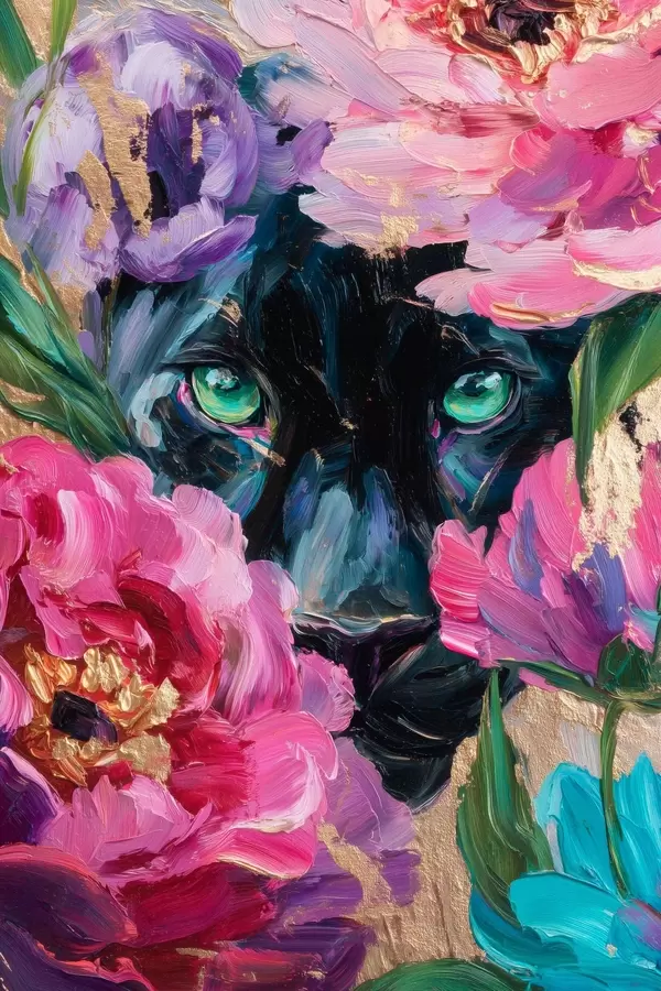 Poster Una pantera negra se asoma entre las peonías. Nr f47936