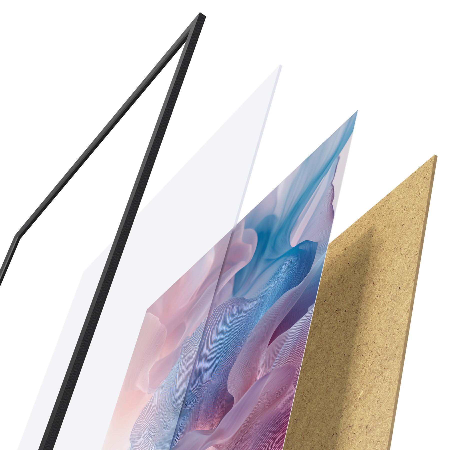 El póster consta de marco, plexiglás, imagen impresa y soporte de aglomerado. El póster puede colgarse inmediatamente en la pared gracias a los soportes de la parte posterior.