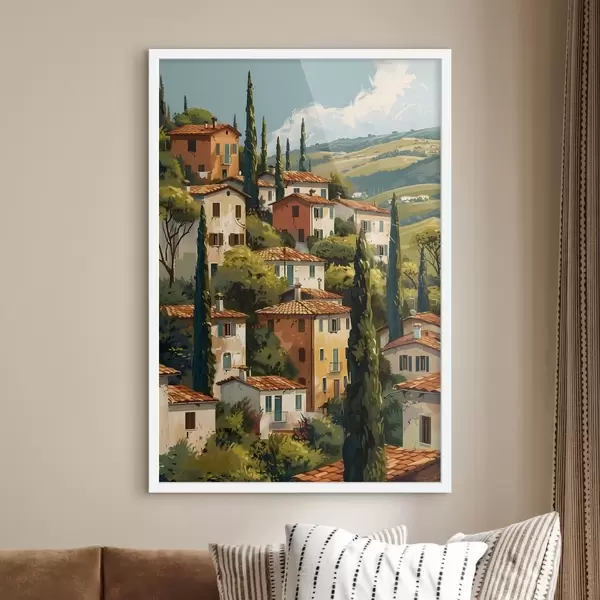 Poster Pueblo mediterráneo en una ladera, con casas de tonos cálidos y tejados de terracota. Nr f47950