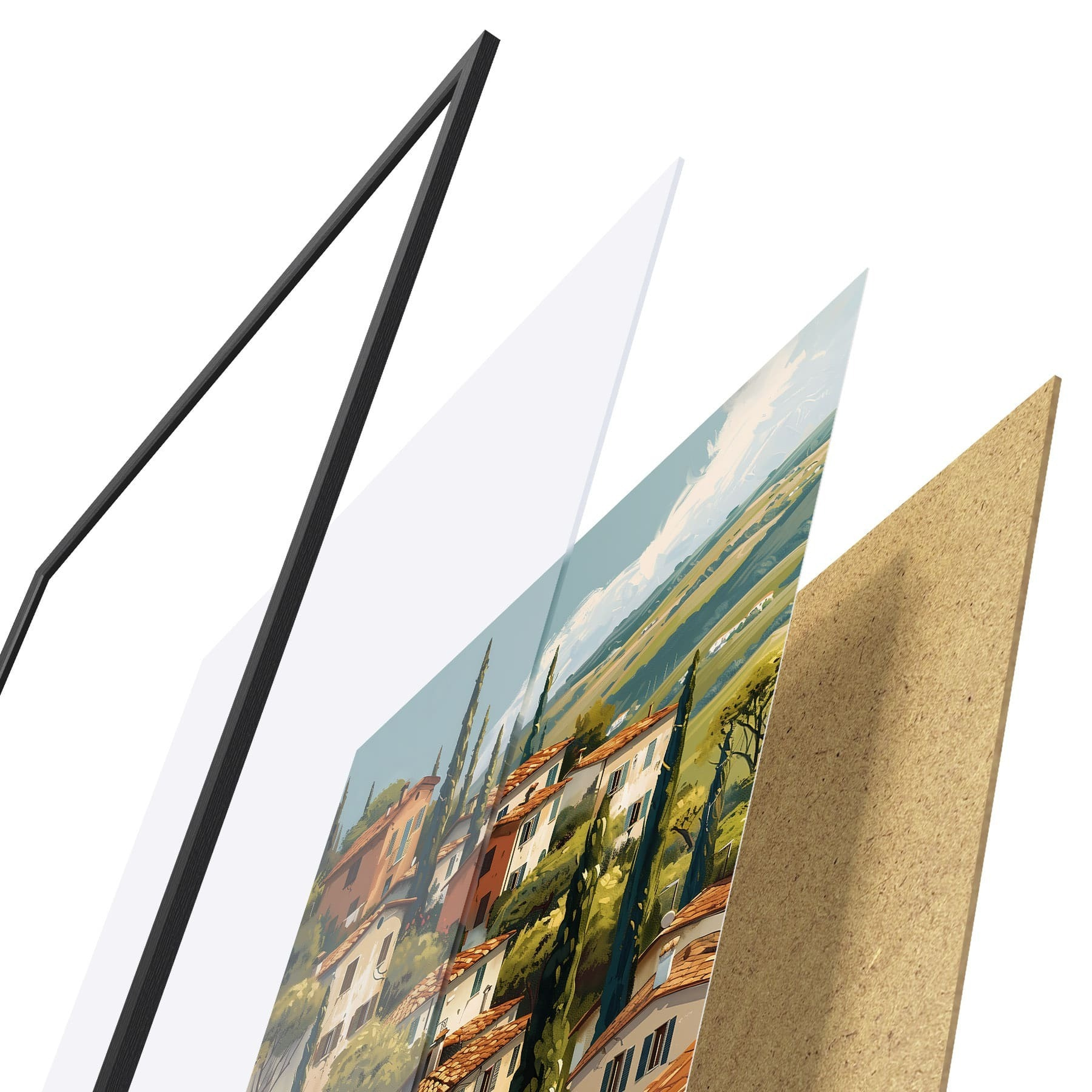 El póster consta de marco, plexiglás, imagen impresa y soporte de aglomerado. El póster puede colgarse inmediatamente en la pared gracias a los soportes de la parte posterior.