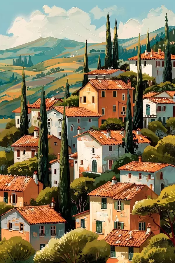 Poster Pueblo mediterráneo en una ladera, con casas de tonos cálidos y tejados de terracota. f47951