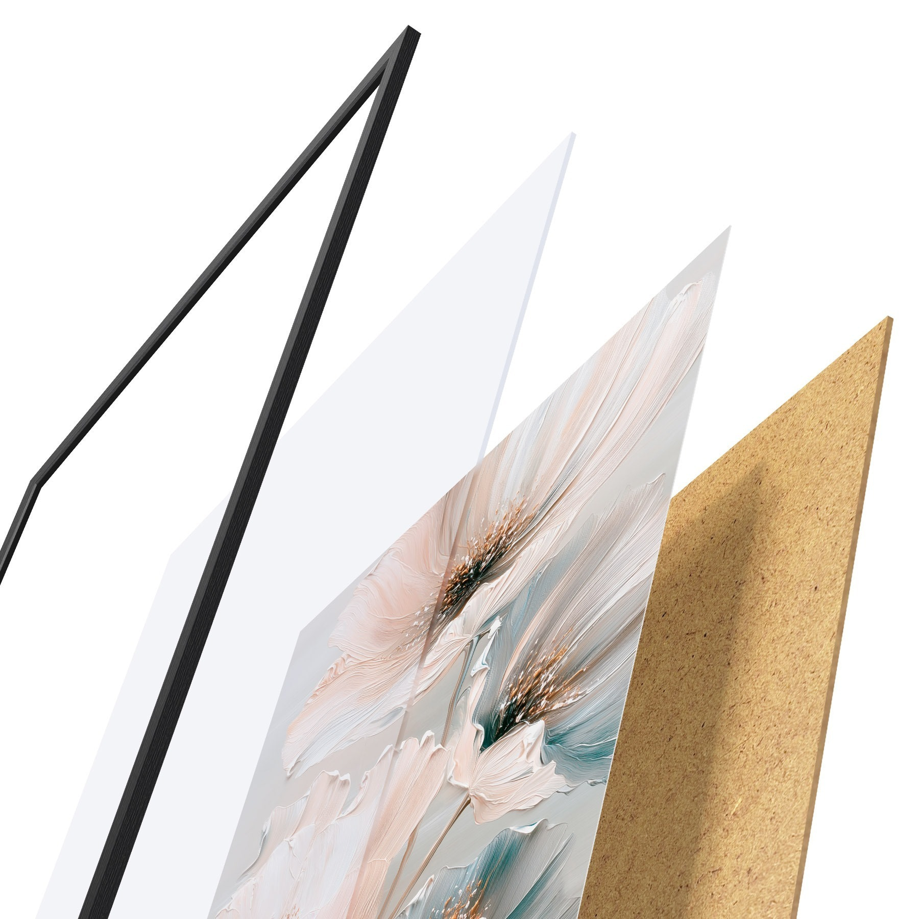 El póster consta de marco, plexiglás, imagen impresa y soporte de aglomerado. El póster puede colgarse inmediatamente en la pared gracias a los soportes de la parte posterior.