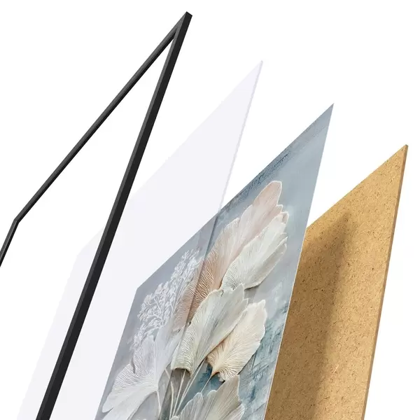 El póster consta de marco, plexiglás, imagen impresa y soporte de aglomerado. El póster puede colgarse inmediatamente en la pared gracias a los soportes de la parte posterior.