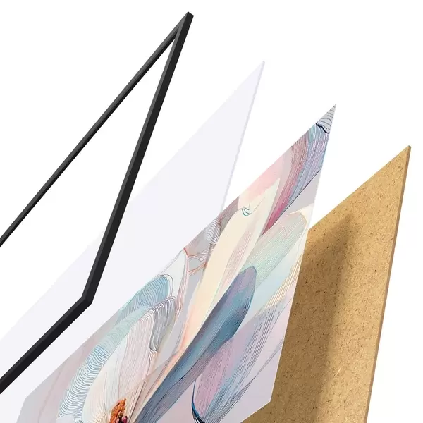 El póster consta de marco, plexiglás, imagen impresa y soporte de aglomerado. El póster puede colgarse inmediatamente en la pared gracias a los soportes de la parte posterior.