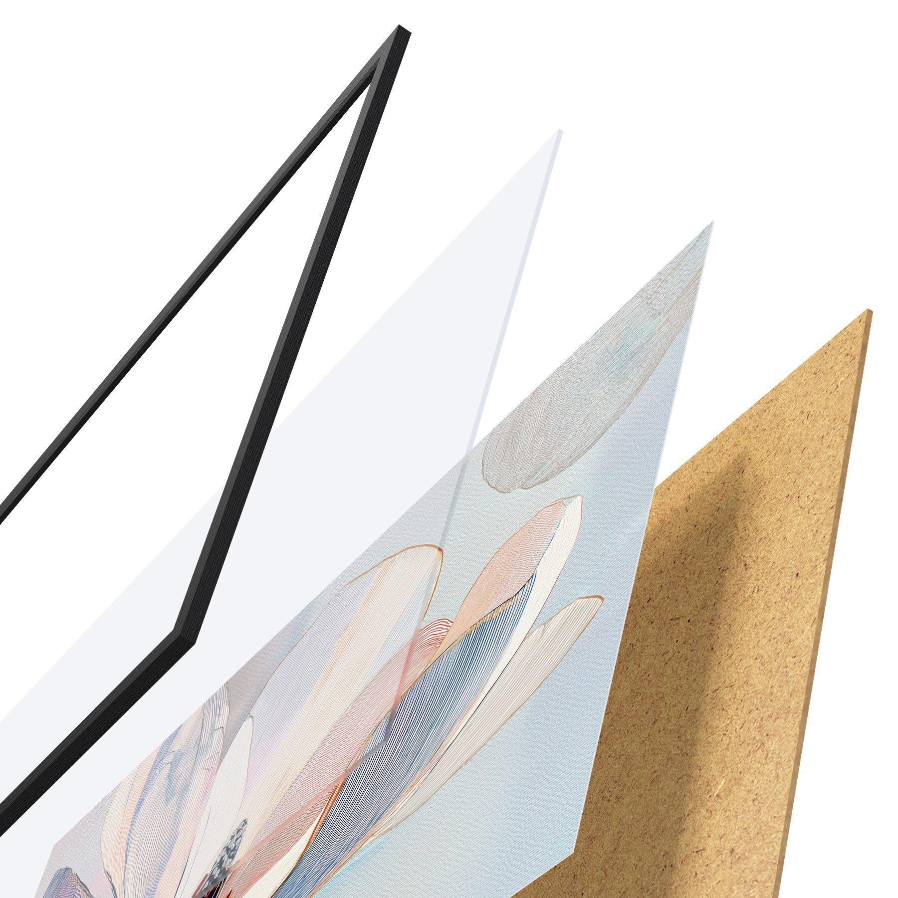 El póster consta de marco, plexiglás, imagen impresa y soporte de aglomerado. El póster puede colgarse inmediatamente en la pared gracias a los soportes de la parte posterior.
